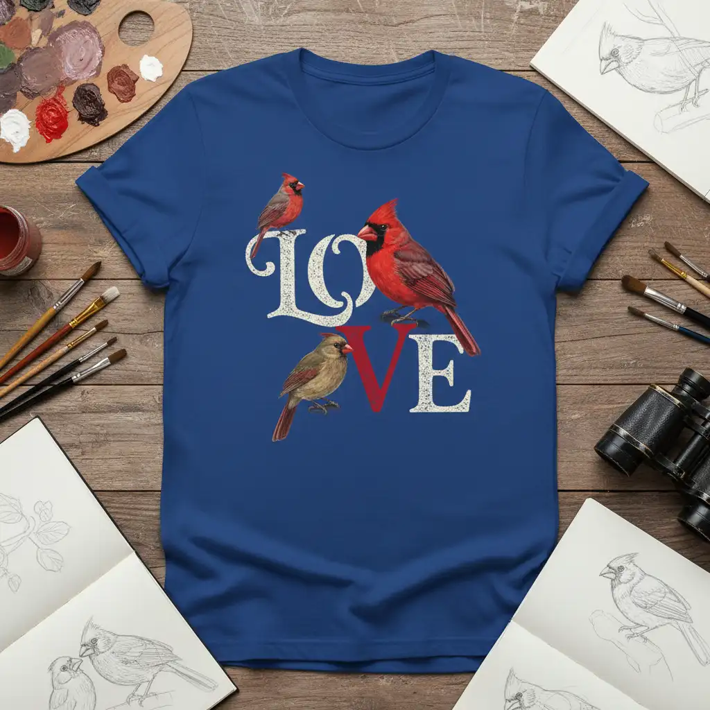 This captivating t-shirt features a unique design where the word “LOVE” is brought to life by beautifully rendered cardinals. Each bird is depicted with remarkable detail, from the vibrant crests of the males to the subtle yet striking features of the females. The integration of the birds with the typography creates a visually stunning piece that stands out from ordinary graphic tees. It’s a perfect way to express your appreciation for ornithology and the natural world around us.