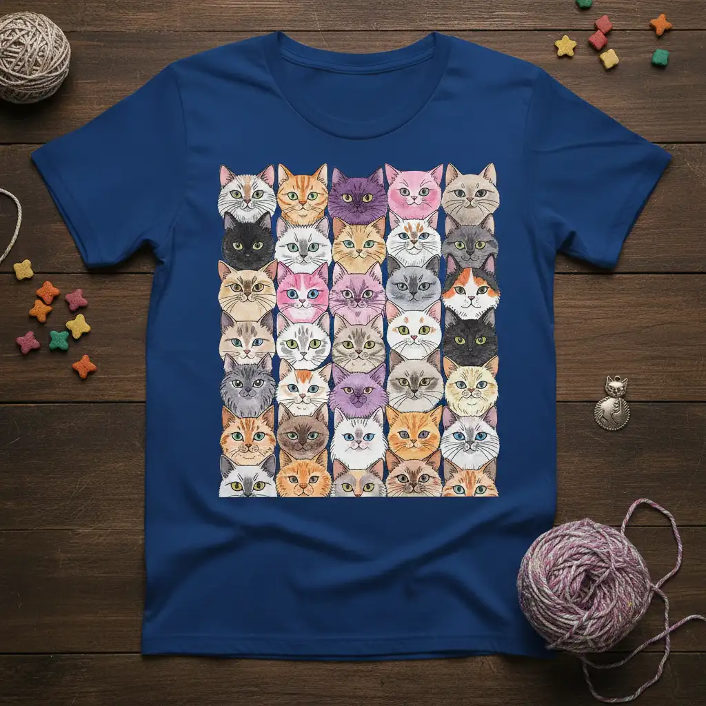This Cat Faces Grid T-Shirt is designed to be a standout piece in any wardrobe, appealing directly to the deep affection people have for their feline friends. The artwork features a delightful array of cat faces, each with its own unique personality and coloring, presented in a neat, eye-catching grid. This visual feast of kitty faces makes it an ideal gift for birthdays, holidays, or just because. It’s a conversation starter and a declaration of love for all things cat-related.