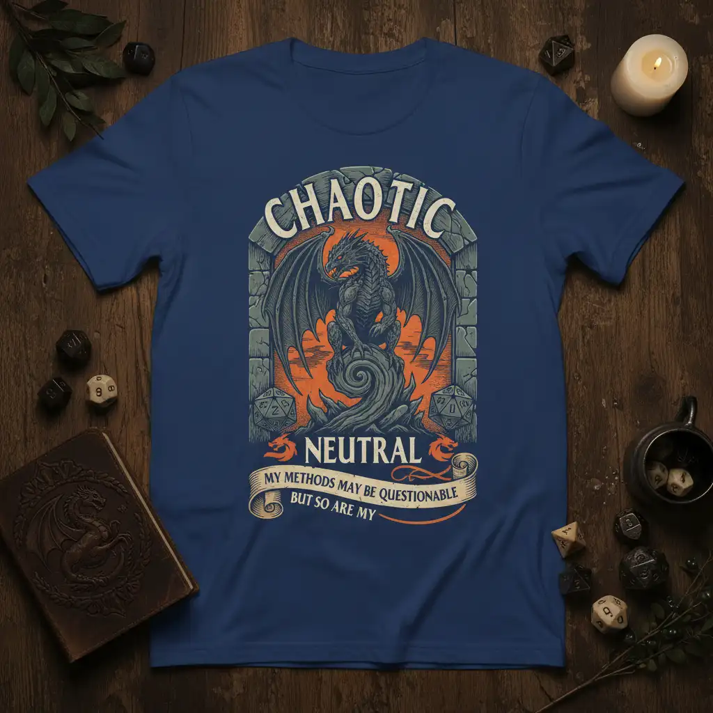 This t-shirt is a must-have for any fan of tabletop role-playing games like Dungeons & Dragons. The phrase “Chaotic Neutral” immediately identifies your character alignment, while the witty quote “My Methods May Be Questionable But So Are My” adds a layer of humor and personality. It’s the perfect way to express your in-game persona or your real-life approach to life. The design is printed on a comfortable, high-quality fabric, ensuring it feels as good as it looks.