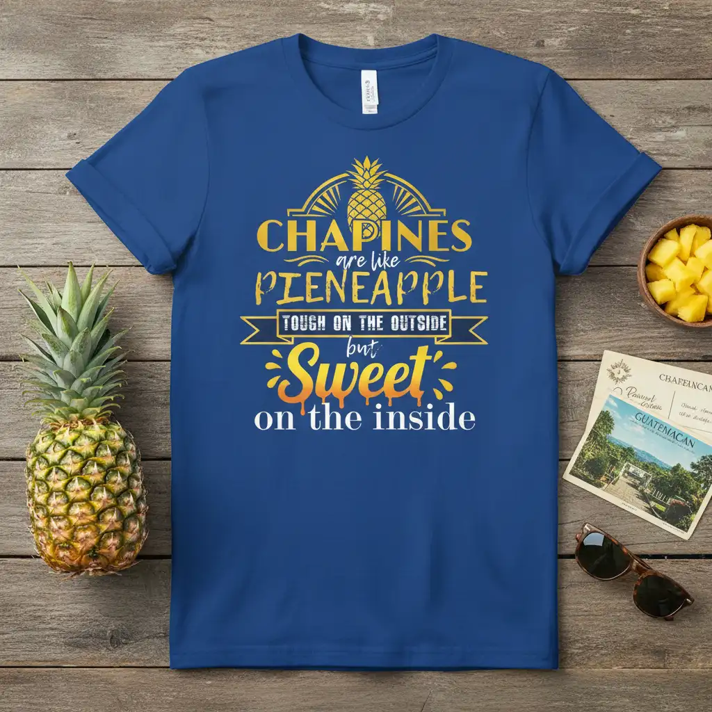 CHAPINES are like PINEAPPLE TOUGH ON THE OUTSIDE but Sweet on the inside – Chapines are like Pineapple: Tough on the Outside but Sweet on the Inside, this vibrant t-shirt captures a unique sentiment with a fun, tropical twist. It’s more than just apparel; it’s a statement about embracing your dual nature. The design combines bold typography with a playful pineapple graphic, making it a standout piece for anyone who appreciates a good quote and a touch of island flair. Perfect for casual outings, beach days, or simply expressing your personality, this tee is a conversation starter. Wear it proudly and let the world know your resilient spirit and sweet disposition.