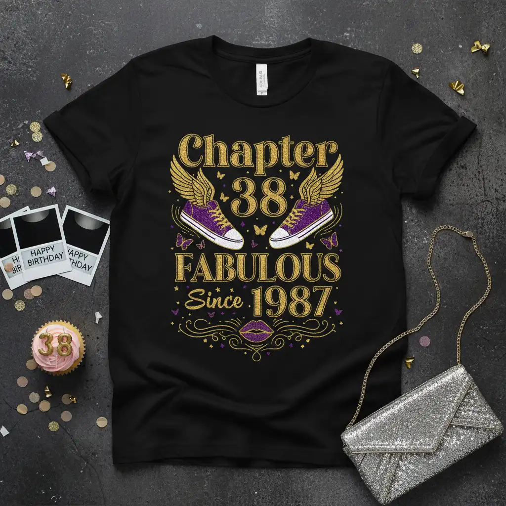 This exclusive t-shirt celebrates the magic of turning 38, commemorating your journey since 1987. The design features the full quote “Chapter 38 FABULOUS Since 1987” in a captivating, glitter-infused font that exudes glamour and sophistication. It’s the perfect apparel for anyone looking to make their 38th birthday unforgettable and stylish.