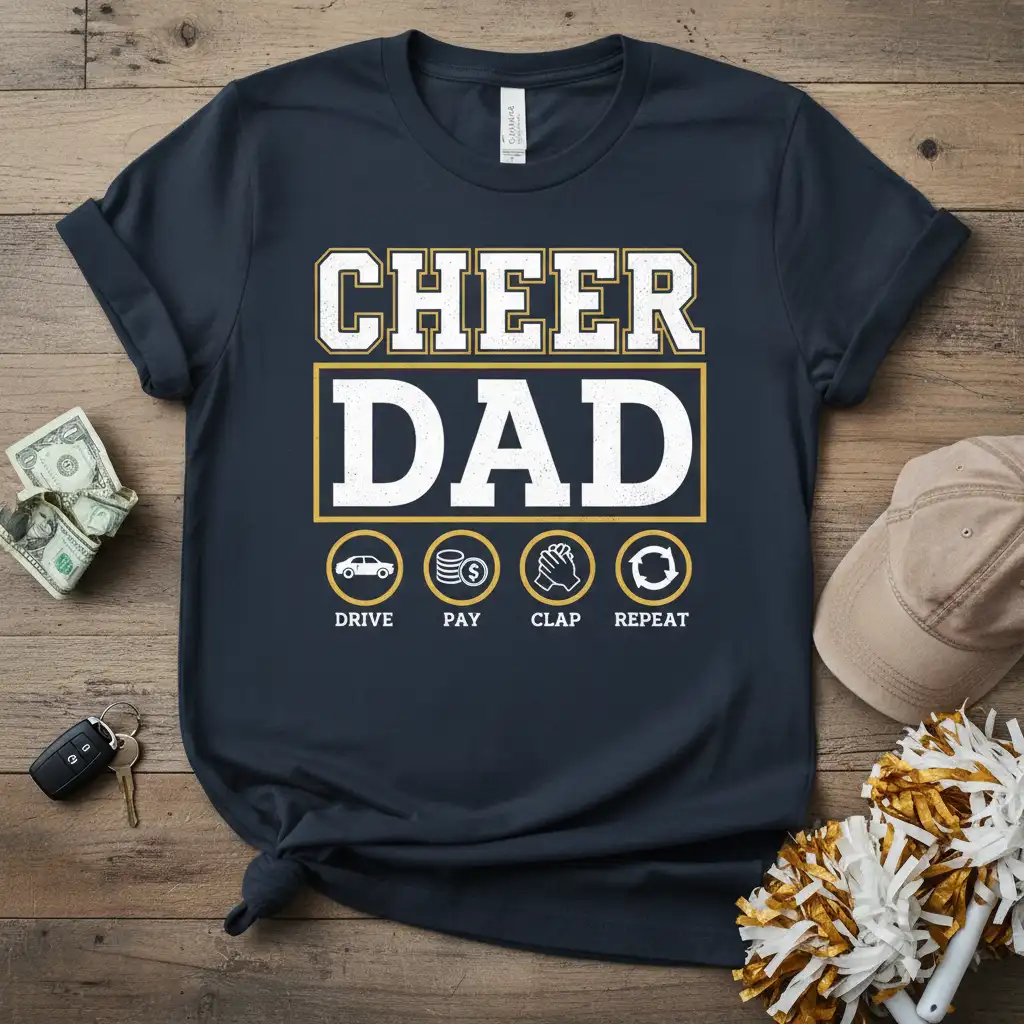 This t-shirt proudly displays “CHEER DAD” in a prominent, eye-catching font, making it clear where your loyalties lie. Below, the simple yet effective icons for “DRIVE,” “PAY,” “CLAP,” and “REPEAT” humorously outline the typical duties of a supportive cheer dad. It’s a lighthearted take on the responsibilities that come with being a cheerleader’s biggest fan, embodying the spirit of unwavering encouragement and logistical support.