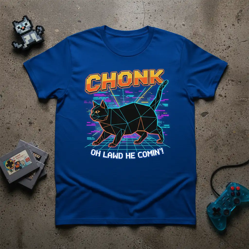This t-shirt proudly displays the hilarious “CHONK OH LAWD HE COMIN’!” phrase, accompanied by a striking visual of a black cat. The design employs a retro-futuristic aesthetic with geometric shapes and pixelated elements, evoking a sense of nostalgia for 80s and 90s gaming and graphics. It’s the perfect way to showcase your love for feline companions and your keen sense of internet humor.