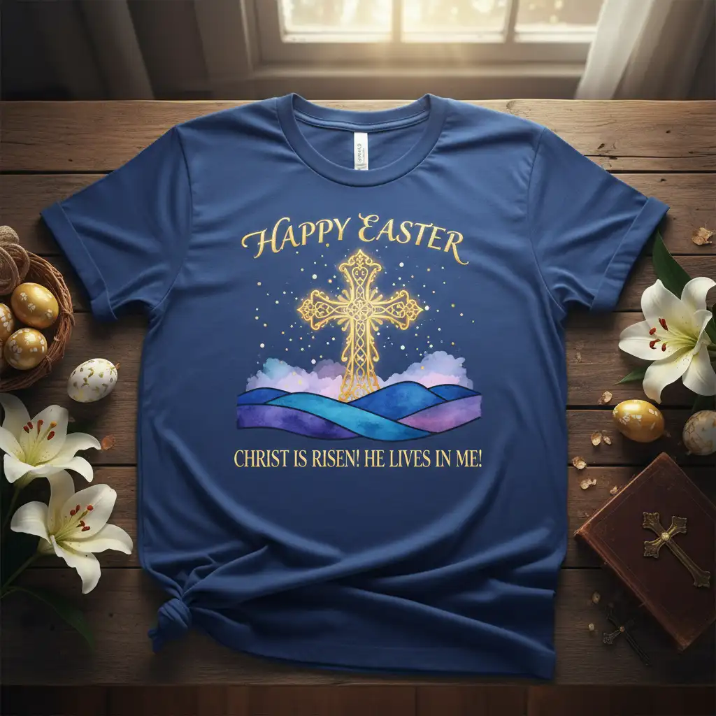 This t-shirt is more than just clothing; it’s a statement of faith designed for the Easter season and beyond. It’s perfect for church services, Easter egg hunts, family gatherings, or simply as a daily reminder of your spiritual journey. The cheerful “Happy Easter” greeting at the top adds a festive touch, making it ideal for holiday celebrations. It beautifully combines religious devotion with stylish design.
