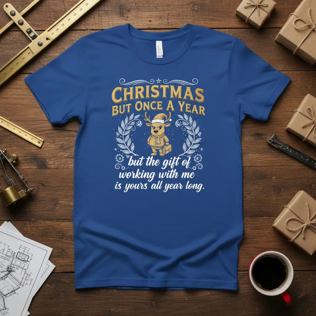 Christmas But Once A Year But The Gift Of Working With Me Is Yours All Year Long is more than just a slogan; it’s a declaration of festive spirit and a humorous take on workplace camaraderie. This unique t-shirt captures the essence of the holiday season while extending the fun and the sentiment throughout the entire year. It’s designed for those who love to inject a bit of personality and humor into their daily lives, especially in an office environment. Get ready to make your colleagues smile with this standout piece of apparel.