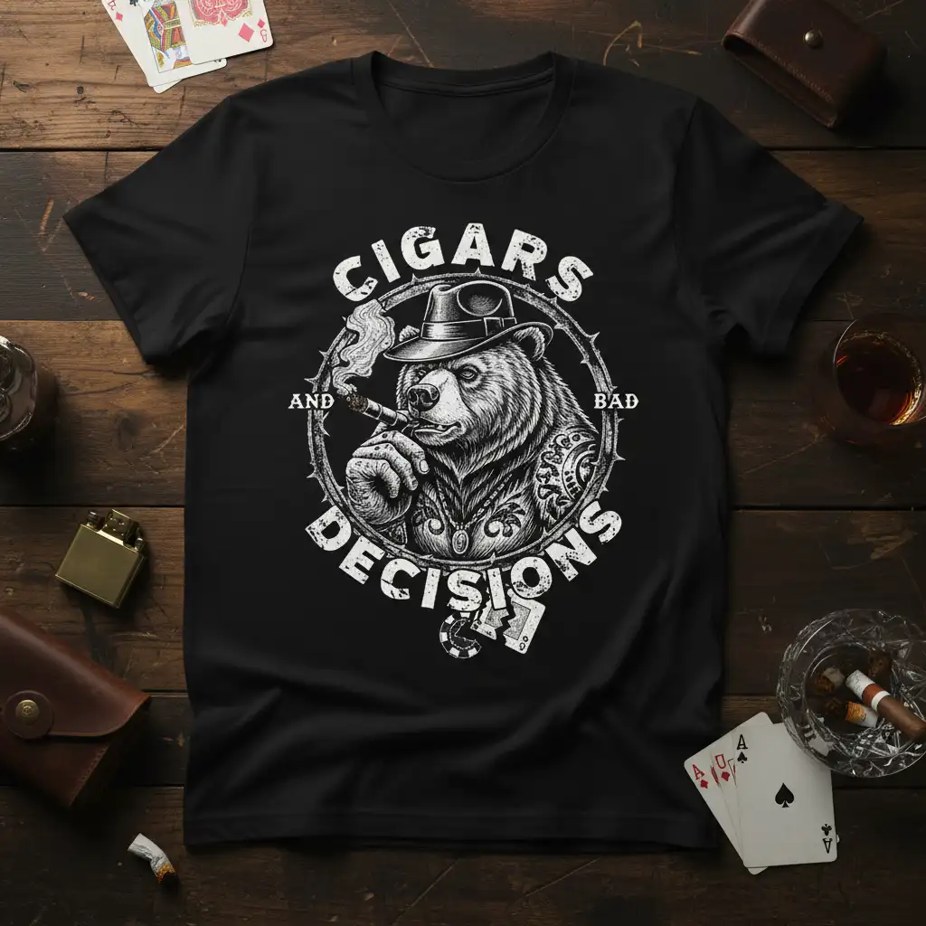 The detailed illustration of the bear is a testament to high-quality graphic design, making this t-shirt a piece of wearable art. Its appeal lies in its ability to capture a certain persona – someone who enjoys the finer things, like a good cigar, while also acknowledging the thrill of making choices that might be considered unconventional. This CIGARS AND BAD DECISIONS design taps into a sense of nostalgia and a hint of playful defiance, appealing to a mature audience.