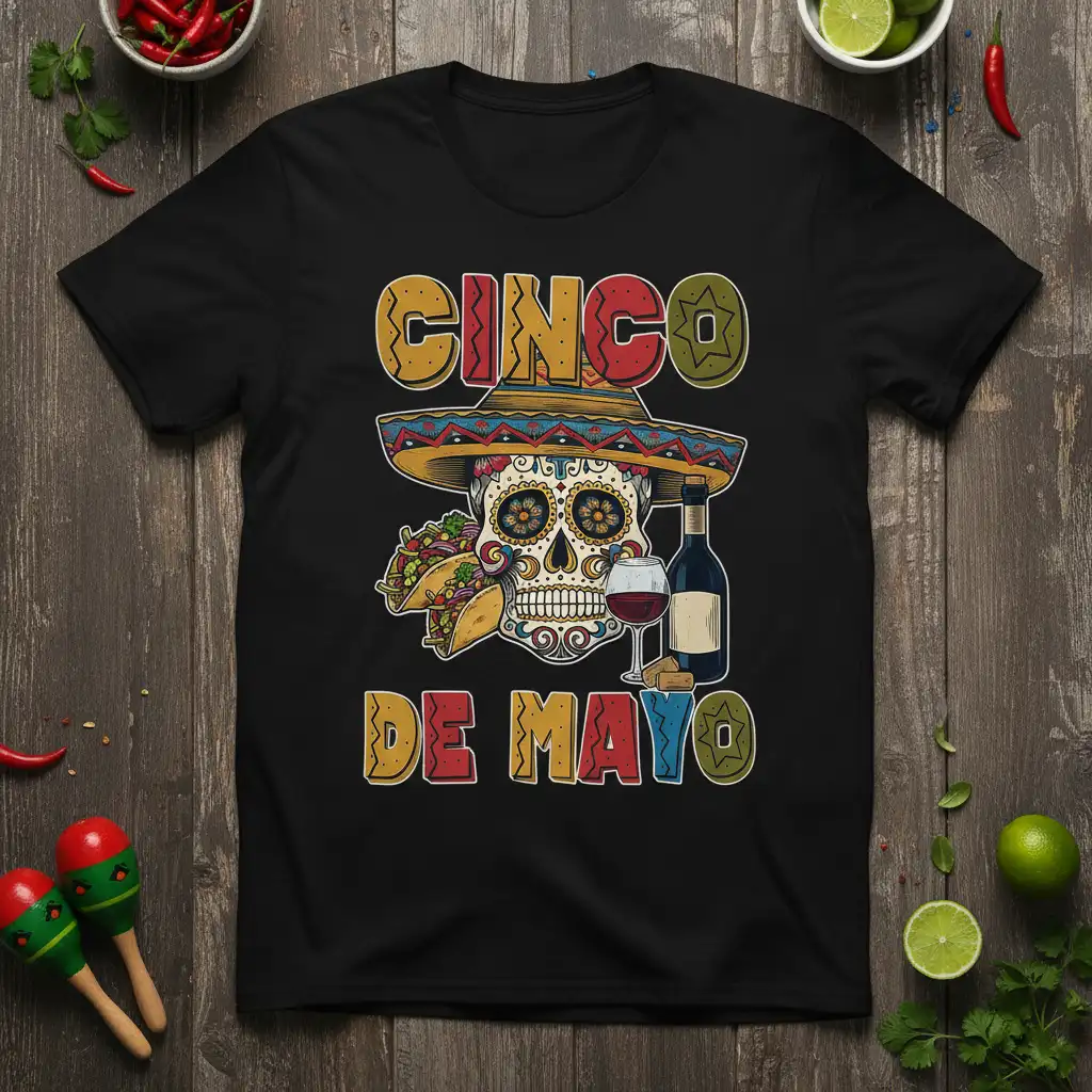 Get ready to party with this incredibly festive Cinco de Mayo t-shirt, designed to make your celebrations unforgettable. The central graphic features a beautifully detailed sugar skull, complete with a traditional sombrero, surrounded by delicious tacos and a glass of wine. This design perfectly embodies the fun and spirit of Mexican culture and festivities. It’s an ideal choice for anyone looking to add a touch of flair and excitement to their Cinco de Mayo outfit.
