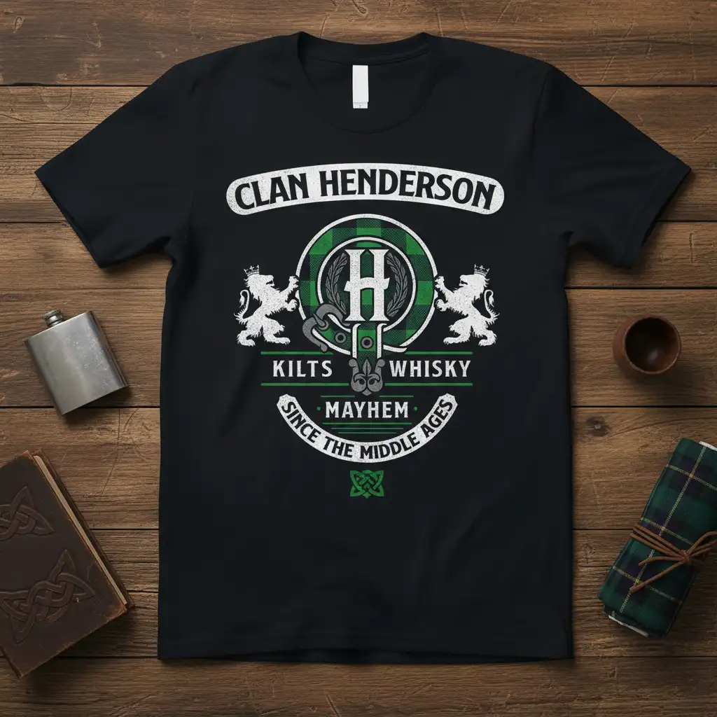 The design boldly proclaims “Clan Henderson,” establishing a direct connection to a storied Scottish family. Below this, the phrase “Kilts Whisky Mayhem” perfectly encapsulates the vibrant spirit and lifestyle often associated with Scottish culture. This combination is a nod to the traditions of wearing kilts, enjoying a dram of good whisky, and the lively, sometimes chaotic, spirit that makes Scottish gatherings so memorable.