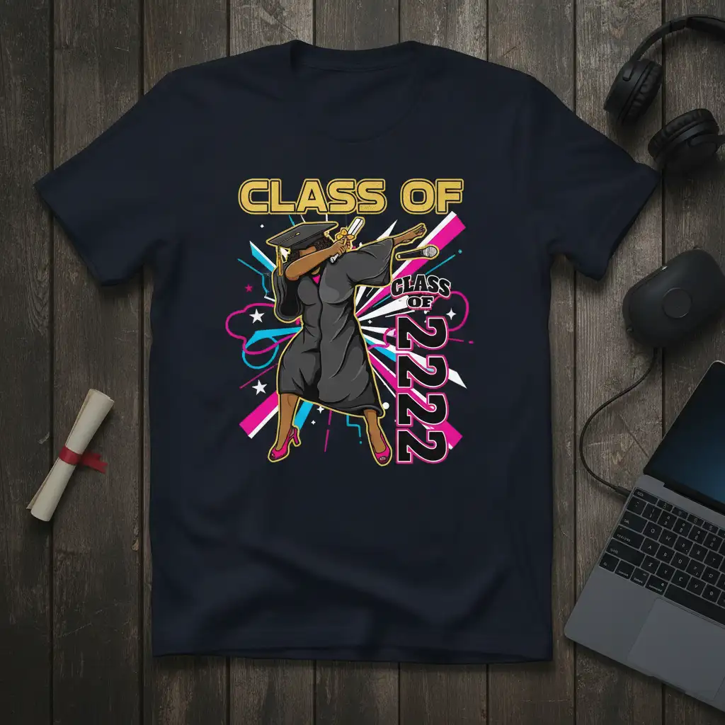 This unique t-shirt celebrates the graduating Class of 2022 with a bold and exciting design. The central graphic depicts a student confidently performing the popular “dab” pose, embodying the celebratory mood of graduation. The “CLASS OF 2022” text is rendered in large, striking letters, ensuring the message is clear and impactful. It’s designed for the modern graduate who wants to express their excitement and achievement.
