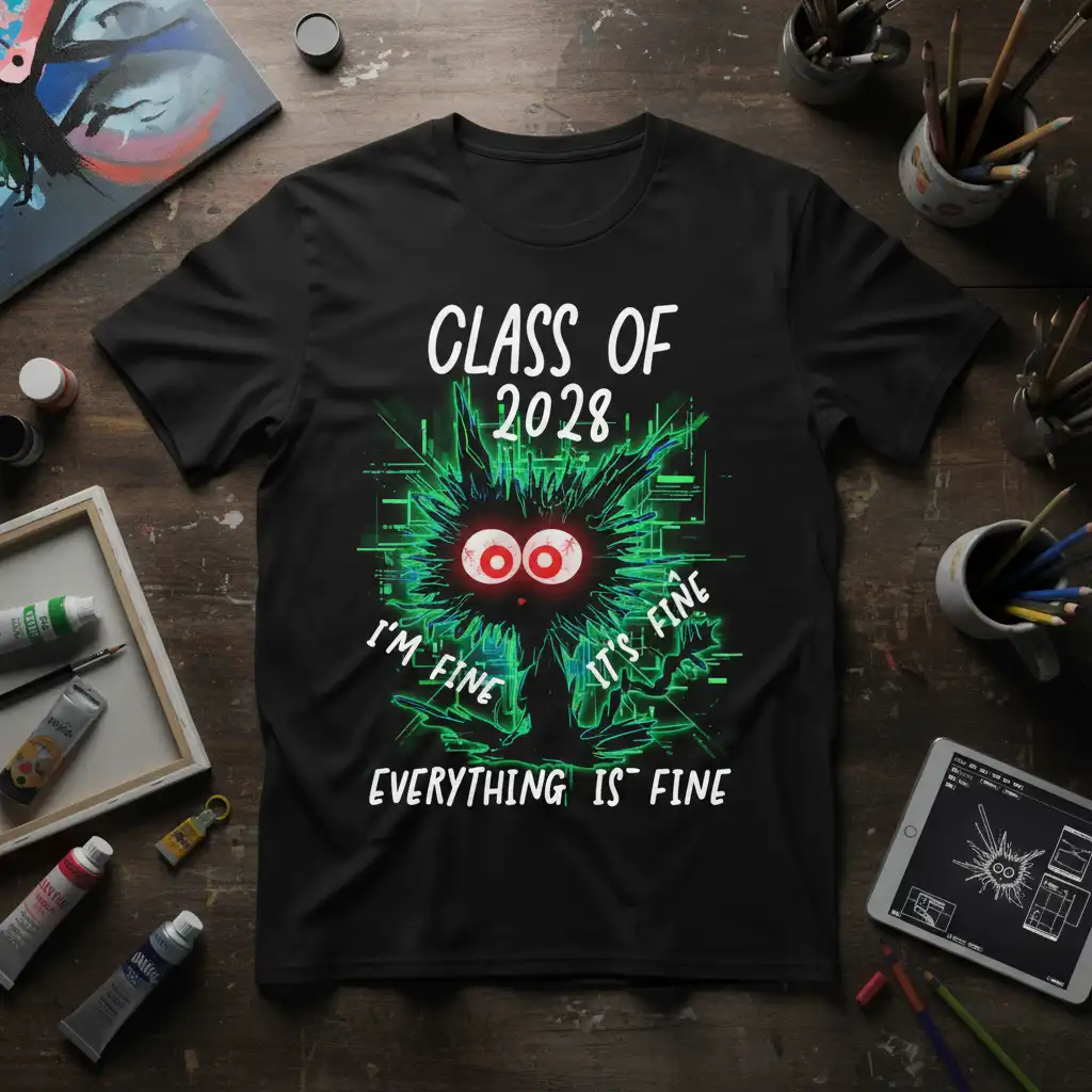 The accompanying graphic adds a quirky and memorable element to the design. The distressed monster character with its wide, red eyes and chaotic green circuitry creates a visual representation of the sometimes overwhelming, yet ultimately “fine,” senior year experience. This combination makes the t-shirt a standout piece for any graduate.