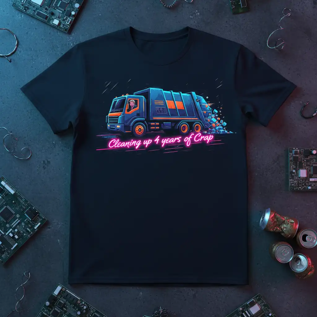 This eye-catching t-shirt features the phrase “Cleaning up 4 years of Crap” in a vibrant, neon-style font that pops against the dark fabric. The accompanying illustration of a garbage truck symbolizes the act of clearing out the old and making way for the new, a sentiment many can relate to. It’s an ideal garment for political enthusiasts, satire lovers, or anyone who enjoys a good laugh about current events.