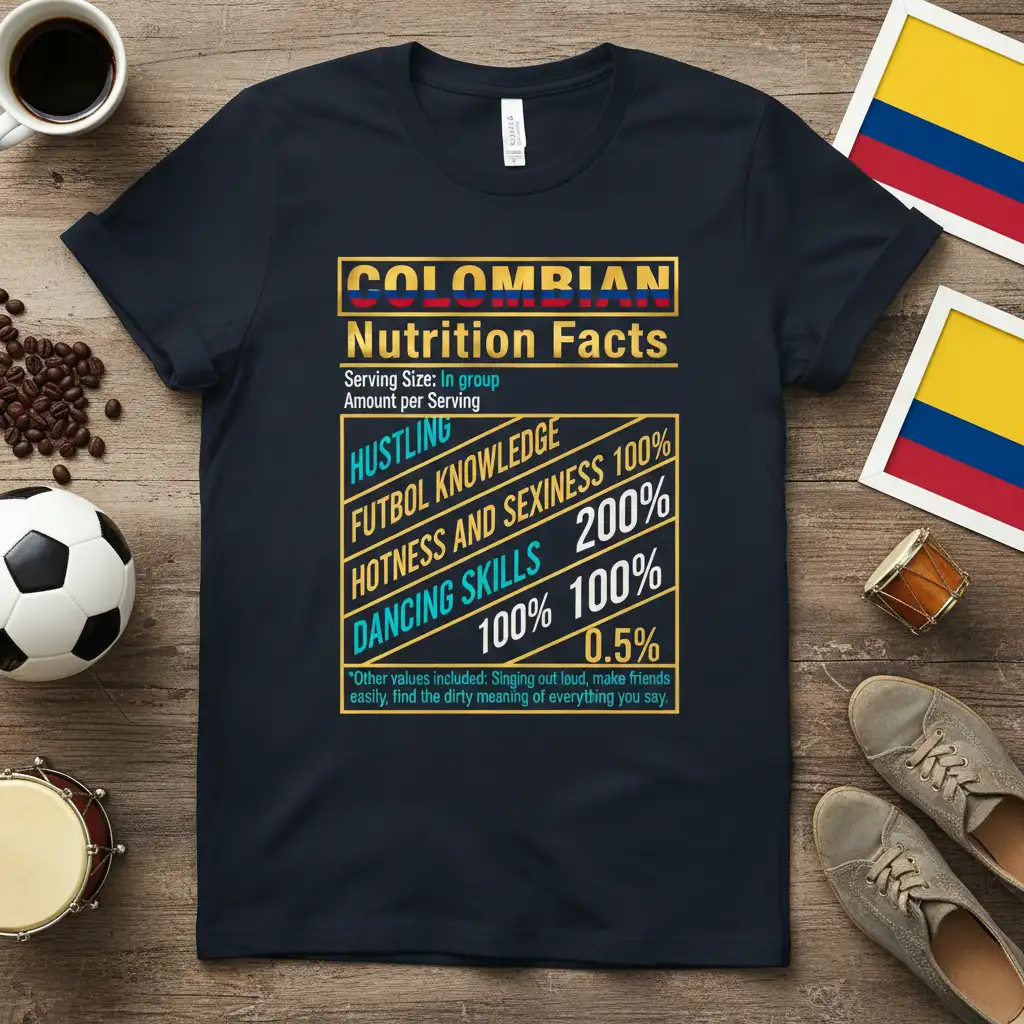 This eye-catching tee features a design inspired by nutrition labels, but instead of calories and fat, it lists the core elements of Colombian identity. Categories like “Hustling,” “Futbol Knowledge,” “Hotness and Sexiness,” and “Dancing Skills” are presented with percentages, humorously quantifying these vibrant aspects of the culture. The design is bold, colorful, and instantly recognizable, making it a standout piece.