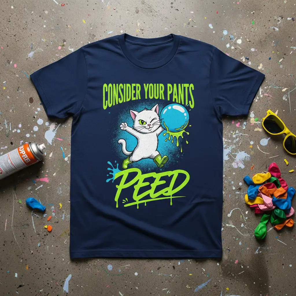 The graphic itself is a work of art, with the cartoon cat exuding personality and charm. The dripping bubble adds an element of surprise and playfulness, perfectly complementing the witty slogan. This CONSIDER YOUR PANTS PEED design appeals to a wide audience, from young adults to those who simply appreciate a good laugh and enjoy quirky, memorable graphics on their clothing. It’s a fun way to stand out from the crowd and showcase your unique sense of style.