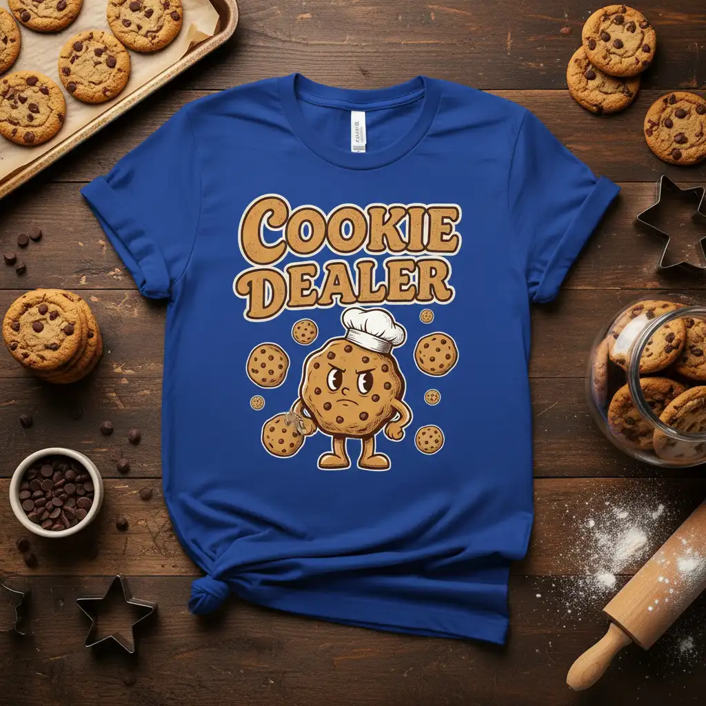 The “Cookie Dealer” graphic tee is an excellent choice for baking competitions, kitchen gatherings, or simply as a daily reminder of your favorite hobby. The design appeals to a broad audience, from kids who love cookies to adults who appreciate homemade goodies. It’s a testament to the universal love for cookies and the people who make them.