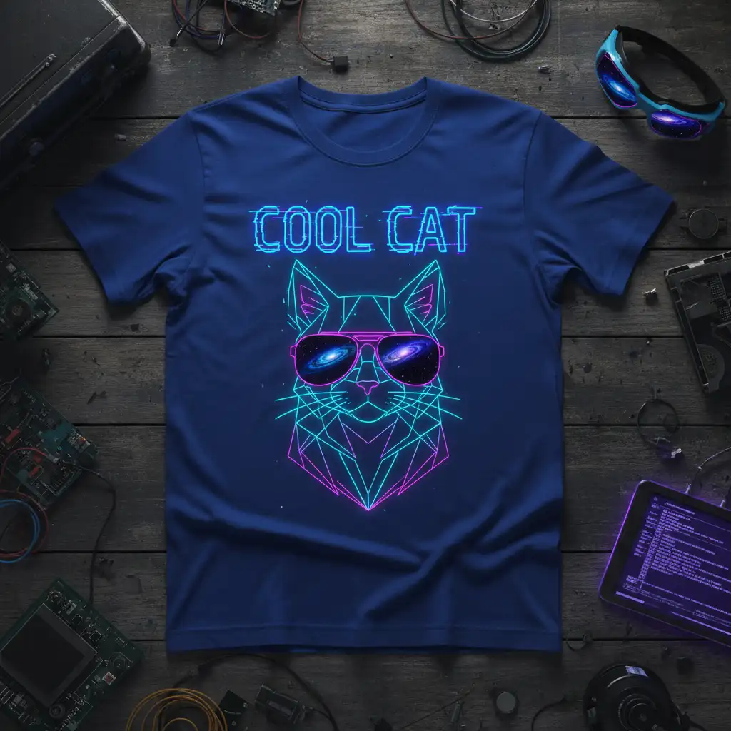 The design features the words “COOL CAT” in a glowing neon blue font, complete with a subtle glitch effect that enhances its digital aesthetic. This t-shirt isn’t just about looking good; it’s about embracing a persona that is both mysterious and captivating. The blend of sharp lines and glowing colors creates a visual impact that is sure to be a favorite for years to come.