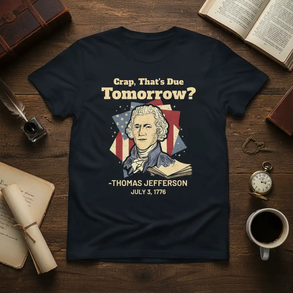 The “Crap, That’s Due Tomorrow?” quote, attributed humorously to Thomas Jefferson and dated July 3, 1776, taps into the universal experience of facing an approaching deadline. This design is perfect for sparking conversations at parties, casual gatherings, or even history class. It’s a conversation starter that’s sure to get people talking and laughing, making it a memorable addition to your apparel collection.