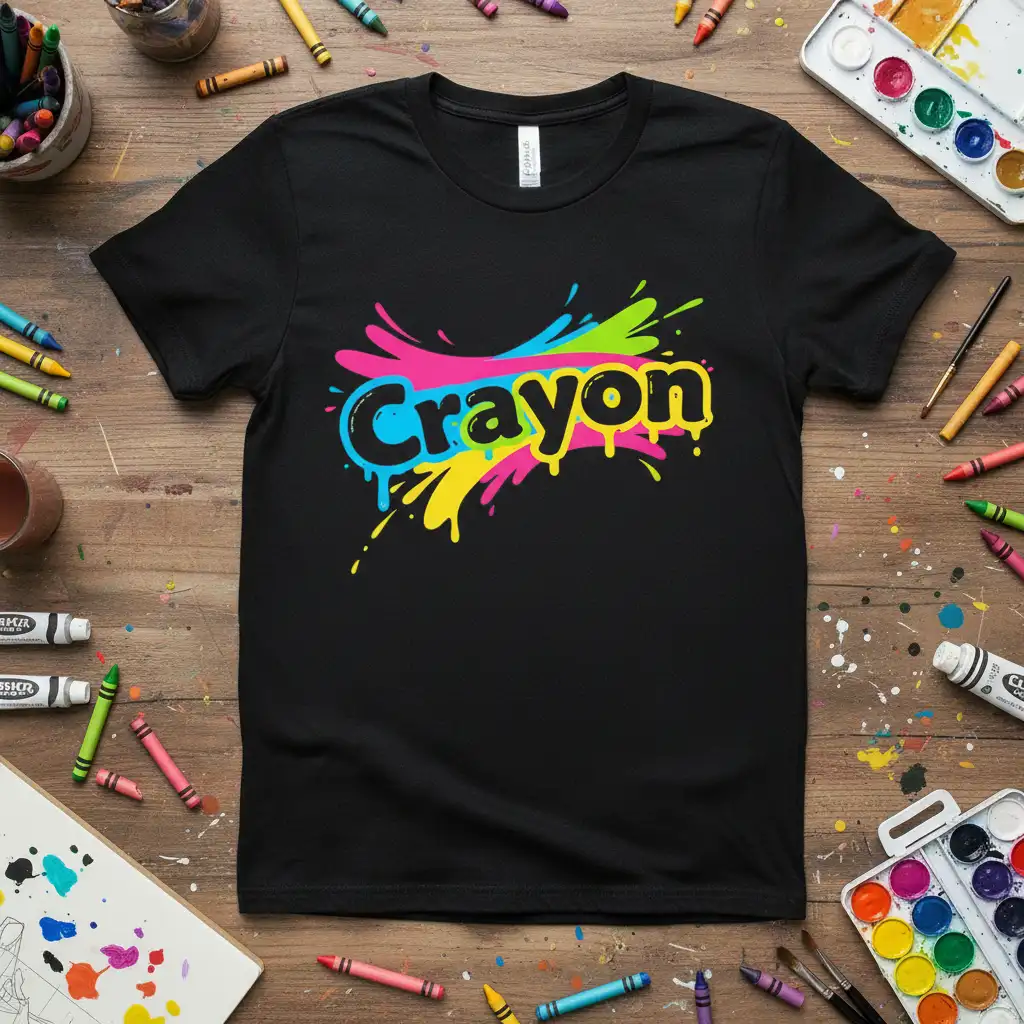 This t-shirt features the word “Crayon” emblazoned in a striking yellow font with a clean black outline. It’s surrounded by an energetic burst of paint splatters in vivid pink, electric blue, and bright green, creating a dynamic and playful visual. The contrast between the bold text and the colorful splash makes this design truly pop on the black fabric. It’s a celebration of art supplies and the joy they bring to the creative process.