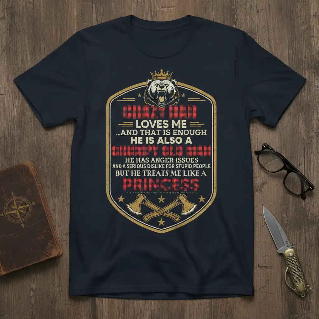 This striking t-shirt design is a celebration of dads who embody a delightful mix of gruff exterior and a heart of gold. The bold typography clearly states the core message: “Crazy Dad Loves Me… And That Is Enough.” It acknowledges the often-humorous reality that dads can be grumpy old men, with a notable disdain for silliness, yet their affection for their children is profound, treating them with the utmost care and adoration, much like a princess.