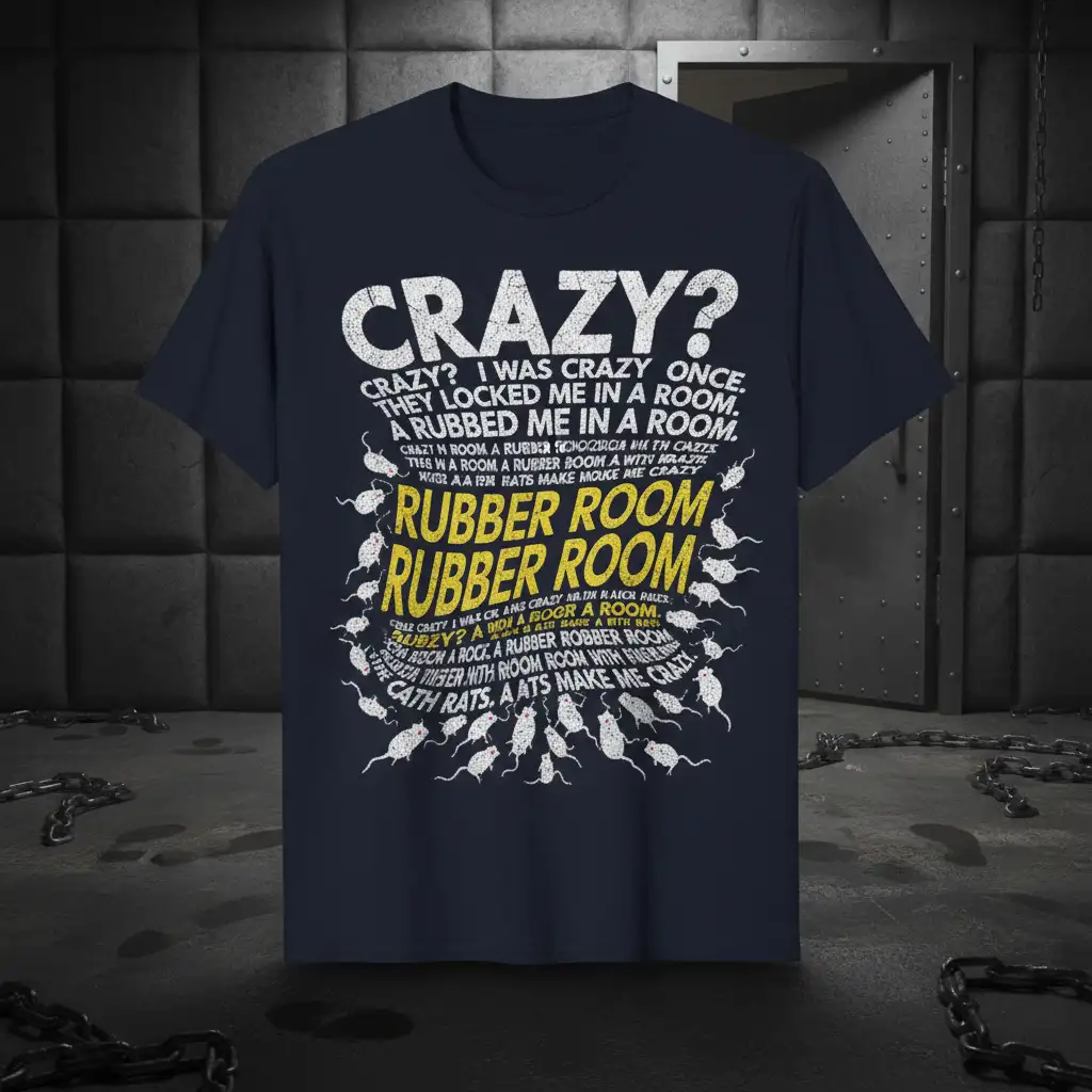 CRAZY? I WAS CRAZY ONCE. THEY LOCKED ME IN A ROOM, A RUBBED ME IN A ROOM. CRAZY M ROOM A RUBBER SCHIZOPHRENIA HA TH CAZTS TIES W A ROOM A RUBBER BOOM A WTV HOLAZTS WAOR AA IRM HATS MAKE MOICE ME CRAZY RUBBER ROOM RUBBER ROOM THE CRAZY I WALK CR AMS CRAZY MILK RACOR RACES. CRAZY? A ROOM A BOOR A ROOM. CRAZY? A BIOL A BOOR A WITH RACH. ROOM A ROCK A RUBBER ROOM ROOM. ROOM A RUBBER ROOM ROOM WITH ENGL WAFER WTH ROOM ROOM ROOM WITH ENGLIS CATH RATS. AATS MAKE ME CRAZY – CRAZY? I WAS CRAZY ONCE. THEY LOCKED ME IN A ROOM, A RUBBED ME IN A ROOM. CRAZY M ROOM A RUBBER SCHIZOPHRENIA HA TH CAZTS TIES W A ROOM A RUBBER BOOM A WTV HOLAZTS WAOR AA IRM HATS MAKE MOICE ME CRAZY This eye-catching t-shirt is designed for individuals who embrace their unique quirks and sense of humor. It features a detailed quote that plays on themes of perceived madness and confinement, all presented with a humorous twist. The striking typography and surrounding rat graphics create a memorable and conversation-starting design that’s sure to make an impact. It’s more than just a shirt; it’s a statement piece for those who aren’t afraid to be different.