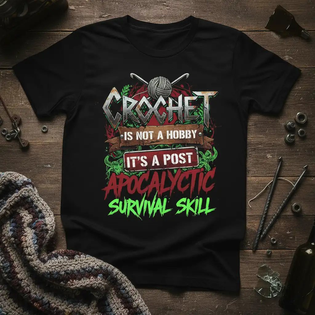 This unique t-shirt celebrates the critical importance of crochet in any scenario, particularly in the face of an apocalyptic event. It humorously highlights how mastering yarn crafts can be a genuinely useful skill for survival. The design is intended for those who take their crocheting seriously and enjoy a bit of dark, witty humor about their passion. It’s a conversation starter and a badge of honor for the dedicated crafter.