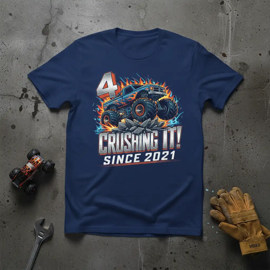 This “Crushing It Since 2021” Monster Truck T-Shirt is the ultimate gear for any 4-year-old boy’s birthday celebration. Featuring a dynamic monster truck graphic with flames and bold text, it’s designed for comfort and durability. Make this birthday unforgettable with a gift that showcases their roaring enthusiasm for trucks!