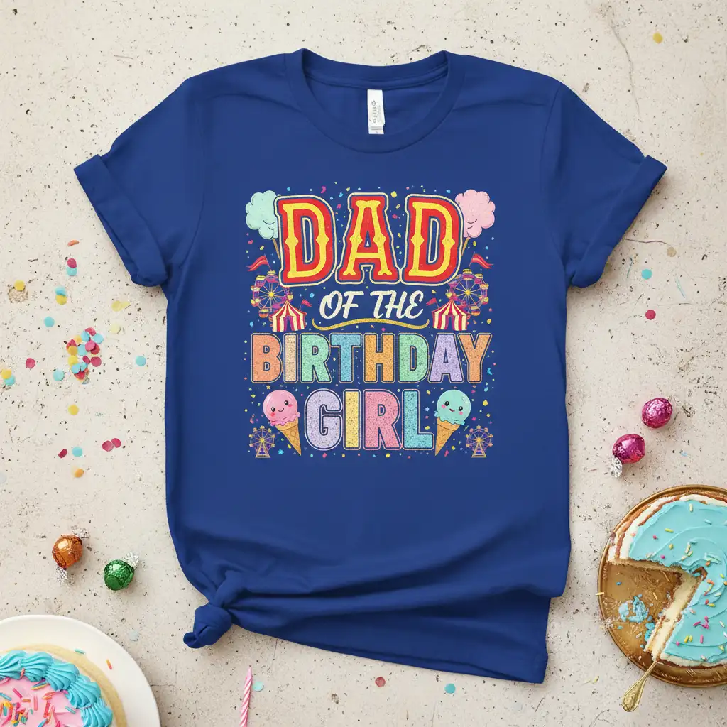 Dad Of The Birthday Girl T-Shirt is here to make any father feel extra special on his daughter’s big day. This eye-catching design captures the essence of a joyful celebration with its vibrant carnival theme, complete with Ferris wheels, tents, and delicious ice cream cones. It’s more than just apparel; it’s a wearable declaration of a dad’s pride and love for his birthday girl. Perfect for parties, photos, or just everyday wear, this tee ensures every dad can showcase his role with a smile.