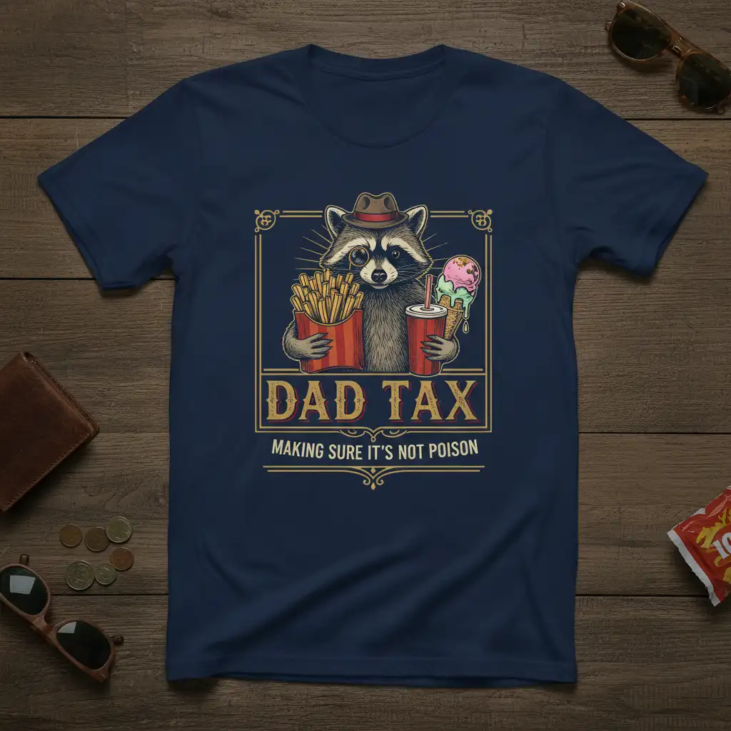 This Dad Tax t-shirt is a must-have for any father who understands the unspoken law of snack distribution. The design cleverly illustrates a raccoon, often associated with scavenging, in a distinguished hat and monocle, diligently guarding a box of fries and a melting ice cream cone. It humorously suggests that dads are the ultimate gatekeepers, ensuring that treats are enjoyed responsibly and, of course, that they get their fair share.