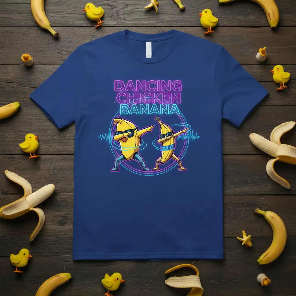 The design showcases two energetic bananas in a dabbing pose, complete with cool sunglasses and vibrant neon-style lettering. The phrase “DANCING CHICKEN BANANA” is boldly displayed, adding to the playful and humorous nature of the graphic. This visual combination creates an unforgettable image that appeals to a wide audience, from fruit enthusiasts to lovers of all things quirky and amusing.
