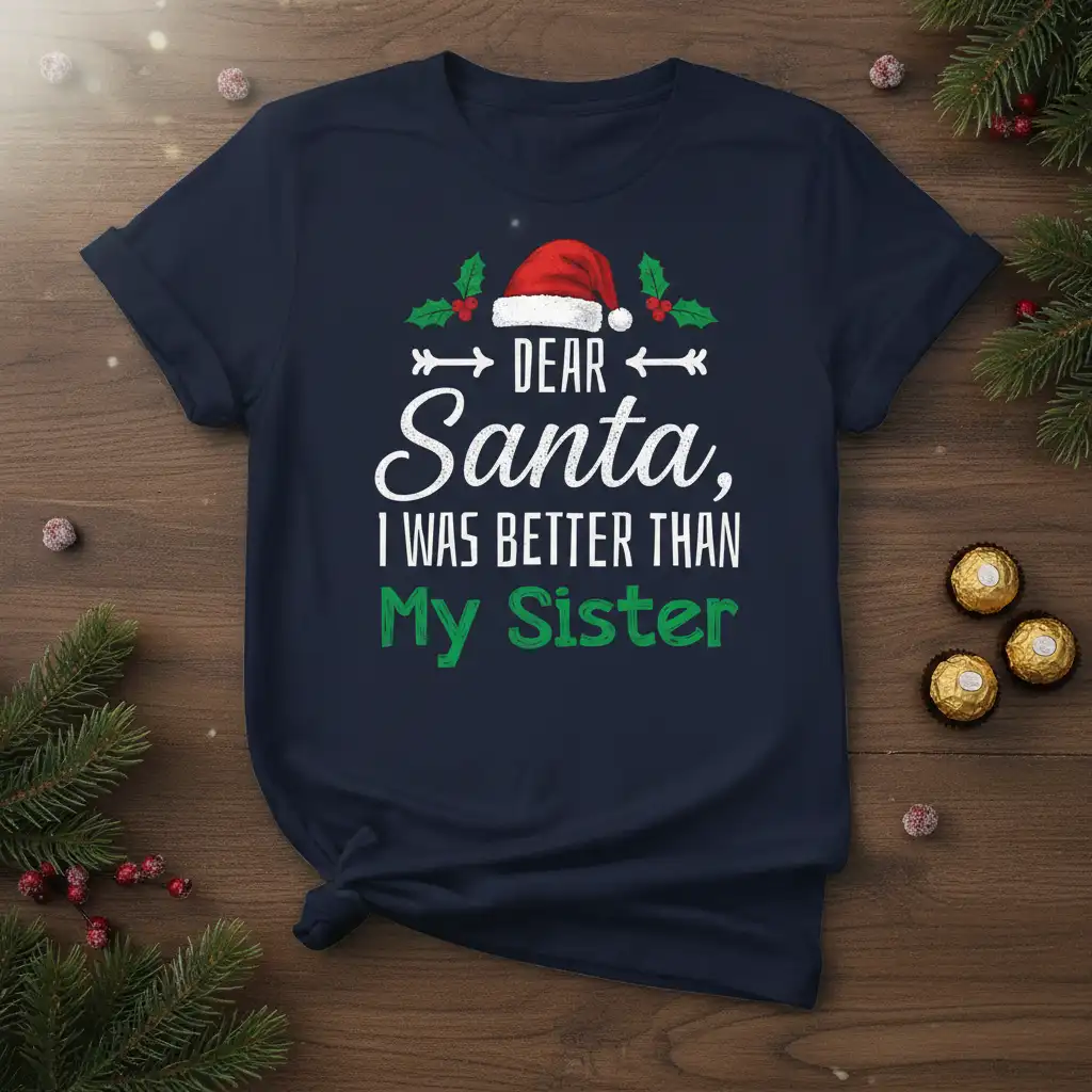 Dear Santa, I was better than My Sister, this Christmas T-Shirt is designed for those who love to playfully tease and share laughter with their siblings. It captures the essence of holiday spirit with a humorous twist, making it a standout piece for any festive occasion. This tee is more than just apparel; it’s a conversation starter and a way to express your unique family dynamics during the most wonderful time of the year. Get ready to bring smiles and maybe a little competitive cheer to your holiday celebrations.