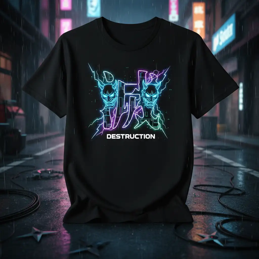 Destruction T-Shirt featuring a striking neon Japanese demon design. This bold graphic tee captures the essence of urban rebellion and cyberpunk aesthetics, making it a must-have for anyone looking to express their edgy style. The electrifying neon colors and intricate demon artwork create a visually captivating piece that stands out from the crowd. It’s more than just apparel; it’s a statement of individuality and a nod to the darker, more mysterious side of fashion. This shirt is designed to turn heads and spark conversations.