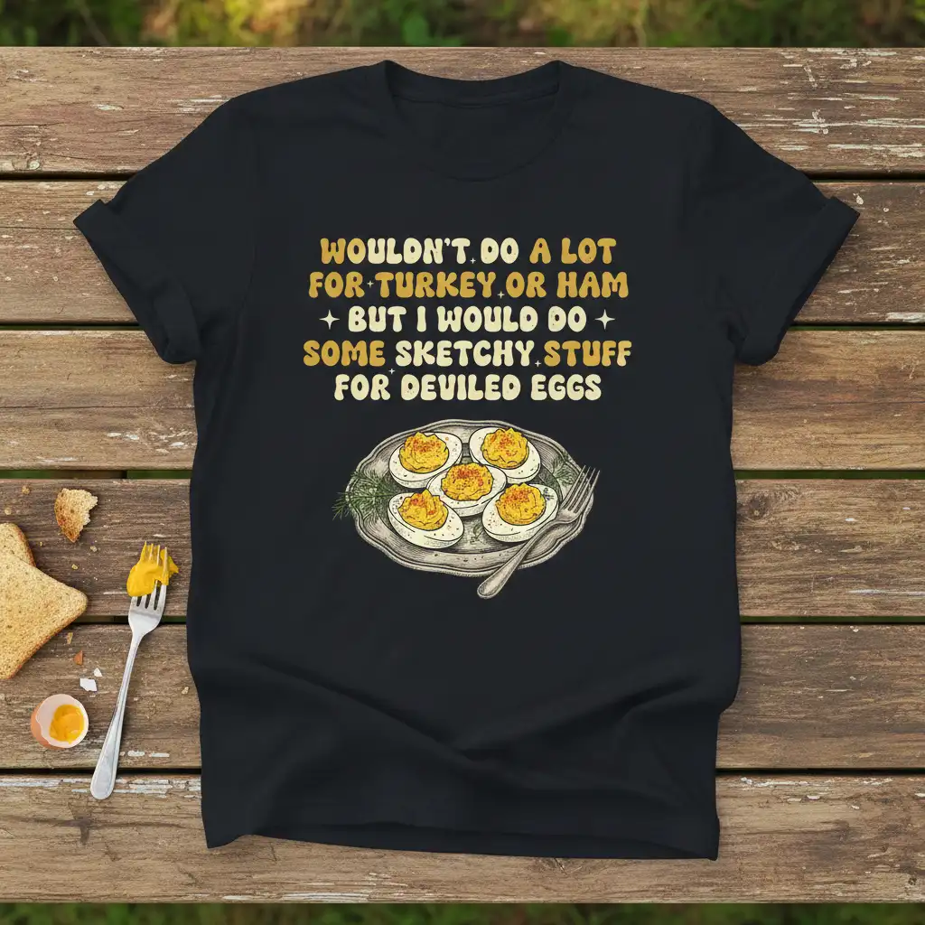 Wouldn’t Do A Lot For Turkey Or Ham But I Would Do Some Sketchy Stuff For Deviled Eggs – this statement perfectly captures the sentiment of true deviled egg aficionados. If your taste buds tingle at the mere thought of these creamy, savory delights, then this t-shirt is designed just for you. It’s a humorous and relatable way to express your dedication to the appetizer that reigns supreme in your heart, especially when compared to more traditional holiday fare.