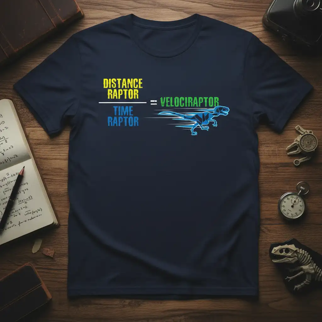This t-shirt brilliantly illustrates the concept of speed using a playful dinosaur analogy. The equation, presented clearly with “Distance Raptor” over “Time Raptor” equaling “Velociraptor,” is a smart nod to the scientific formula for velocity. The accompanying graphic of a swift-looking velociraptor in mid-stride adds a dynamic visual element that perfectly embodies the idea of speed and agility.