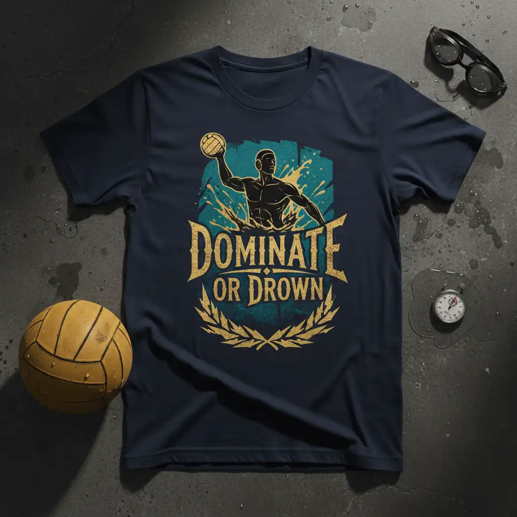 This “Dominate or Drown” t-shirt is more than just clothing; it’s a piece of motivational gear designed to fuel your performance. The striking graphic features a powerful depiction of a water polo player, surrounded by dynamic water splashes and a laurel wreath symbolizing victory. It’s a visual representation of the drive to excel and the pursuit of triumph in athletic endeavors.
