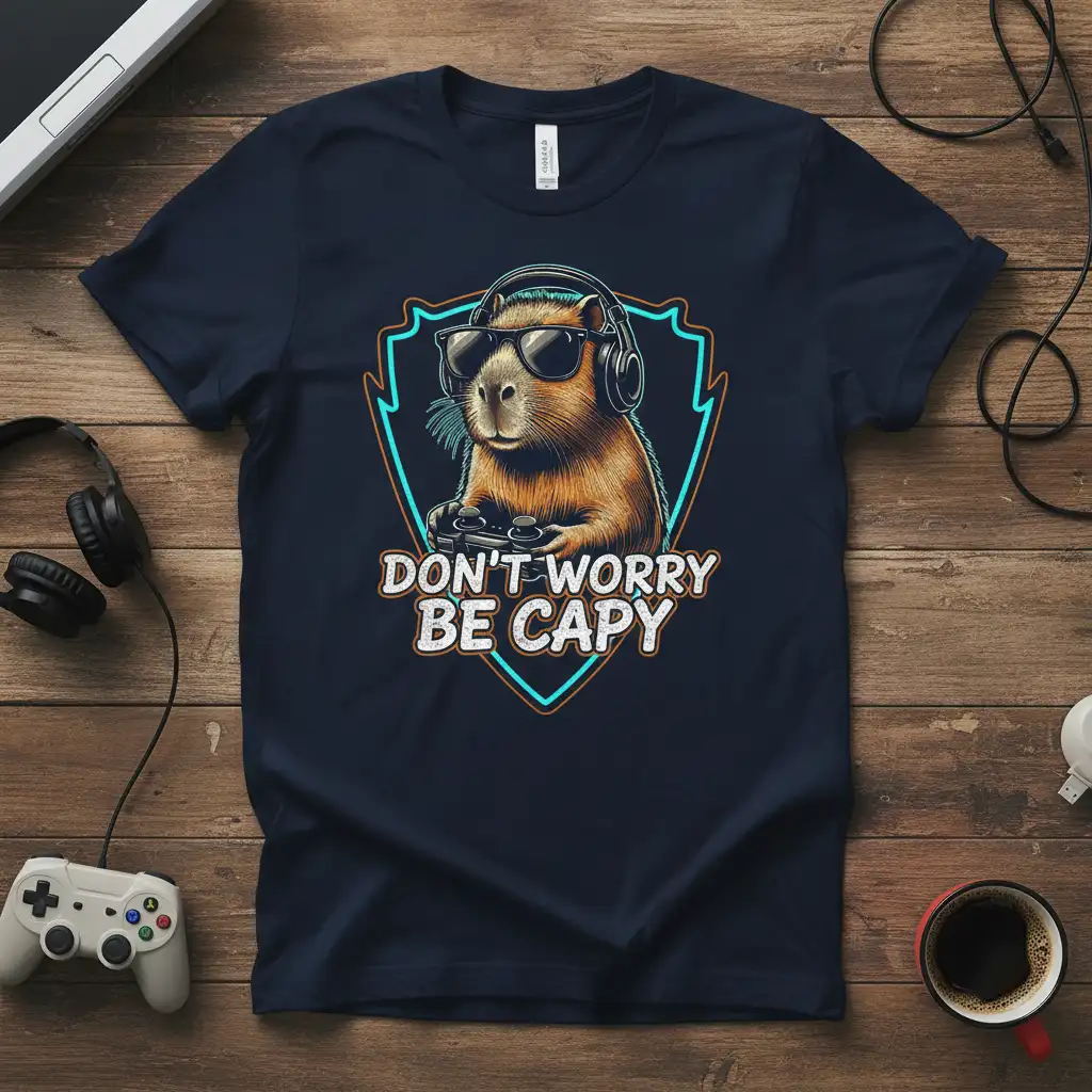 This t-shirt features an incredibly detailed graphic of a capybara sporting stylish sunglasses and headphones, completely immersed in a gaming session. The text “DON’T WORRY BE CAPY” is prominently displayed, making a bold statement. It’s the perfect blend of animal appreciation and gamer culture, designed for those who find joy in both virtual worlds and the serene presence of capybaras.