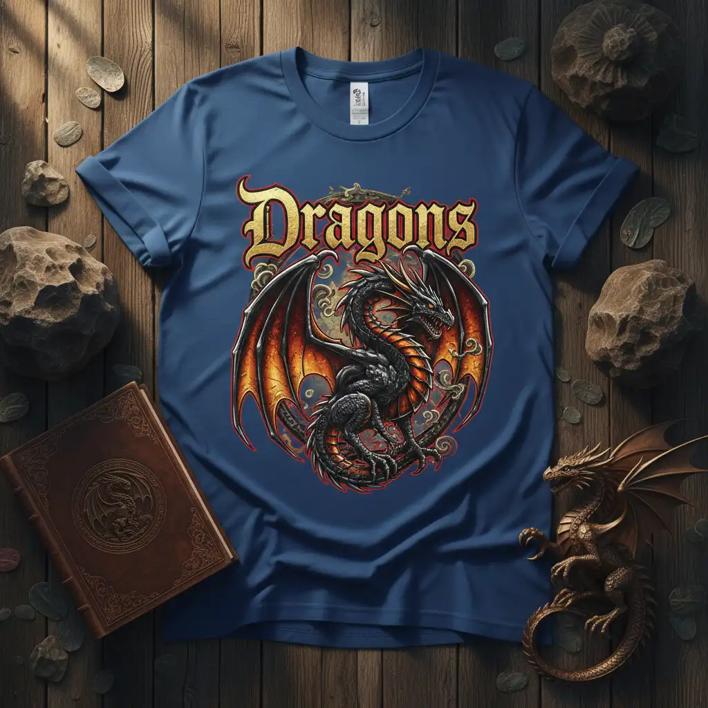 The intricate design prominently displays the word “Dragons” in a striking, ornate gold font that evokes ancient lore and epic tales. This regal lettering is perfectly complemented by the detailed illustration of a powerful dragon, rendered in deep black with vibrant, fiery orange and red accents on its wings. The artwork is meticulously crafted to capture the fierce beauty and raw energy of these mythical beasts, making it a standout piece in any wardrobe. It’s an ideal way to express your fascination with fantasy and the captivating world of dragons.