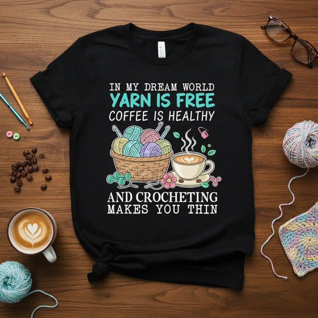 For those who dream of endless yarn and healthy coffee, this t-shirt is a must-have. The bold white and teal lettering clearly states the ideal scenario for any crafter. It’s a playful reminder that in a perfect world, yarn would be abundant and free, and coffee would be a guilt-free indulgence that also contributes to a healthy lifestyle. This sentiment resonates deeply with the crafting community, where passion often fuels countless hours of creative work.