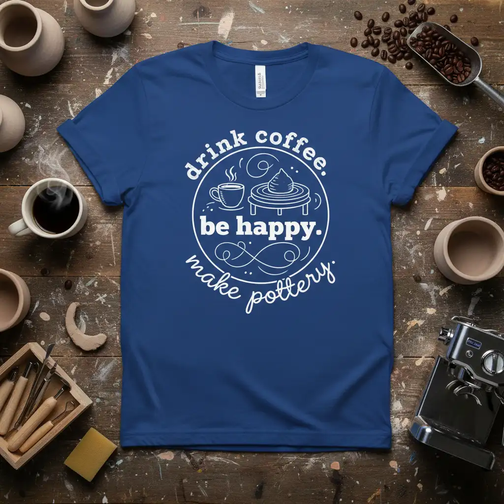 Pick from Black, Navy, Royal, Dark Heather, Red, and White to match your mood and wardrobe staples. Each colorway keeps the drink coffee. be happy. make pottery. design clear and photo-ready for everyday wear.
