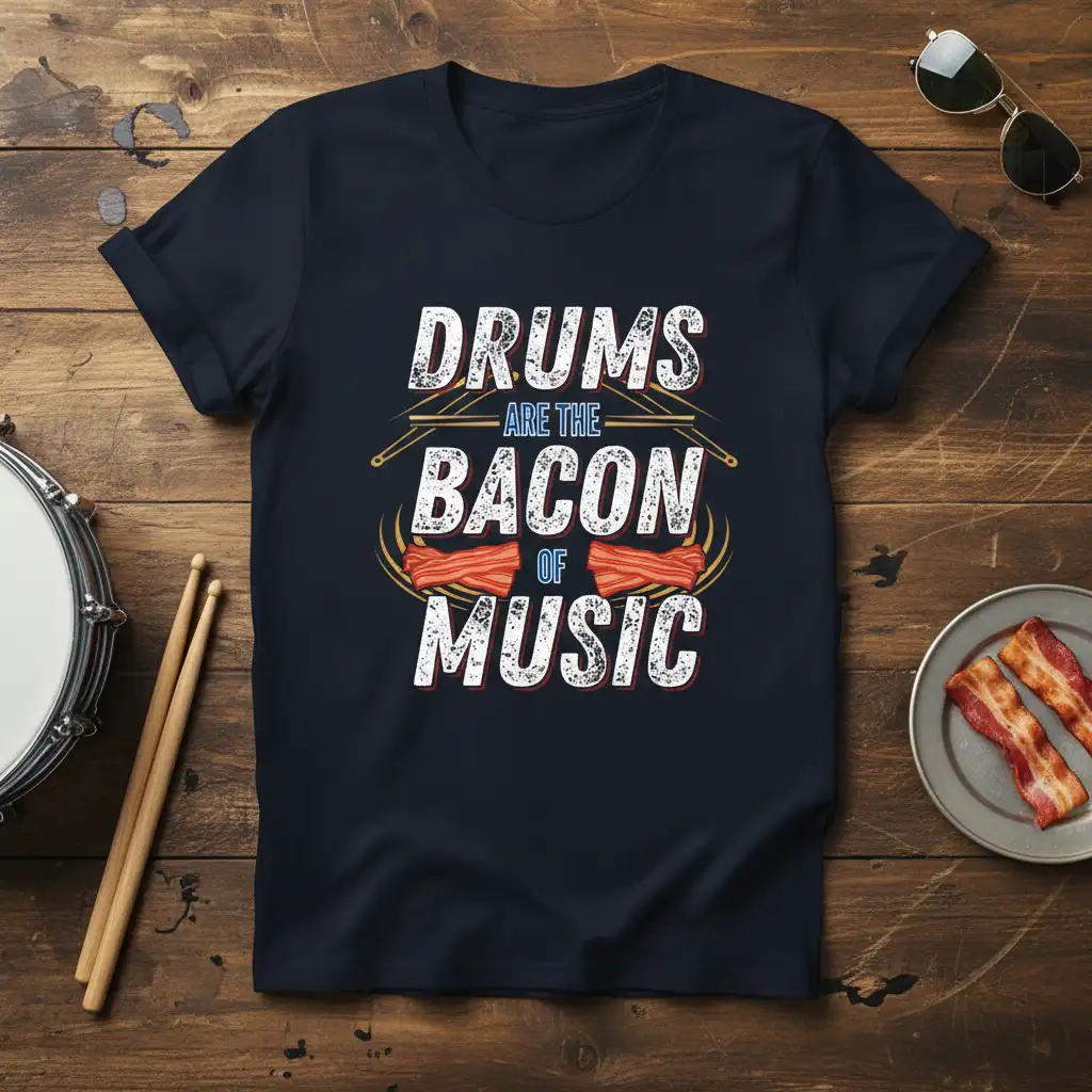 The graphic elements, featuring stylized drumsticks and strips of mouth-watering bacon, visually reinforce the core message. They add a playful yet bold dimension to the design, making it stand out. Whether you’re hitting the stage, practicing in your studio, or just out and about, this shirt announces your love for the groove with a touch of culinary humor.