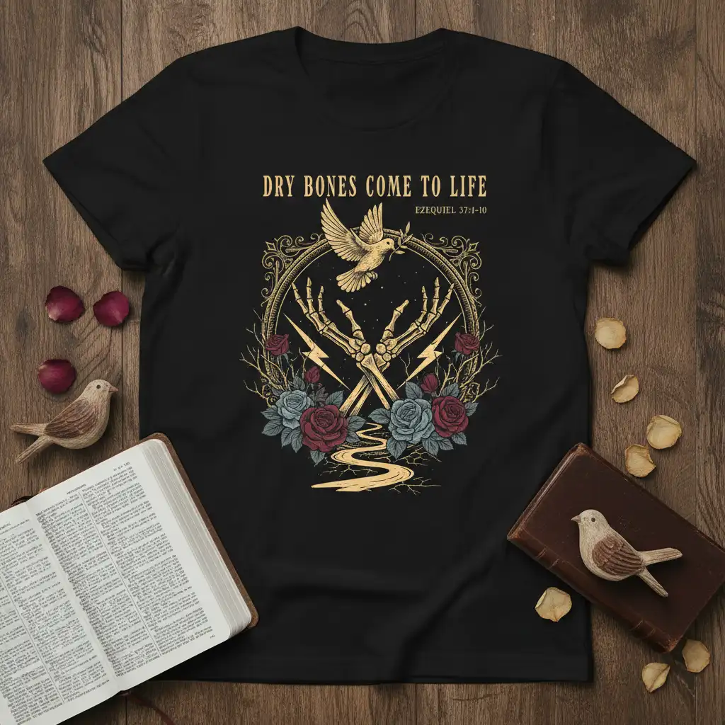 Dry Bones Come To Life Ezekiel 37:1-10 shirt is more than just apparel; it’s a wearable declaration of faith and hope. This powerful design draws inspiration from a profound biblical passage, symbolizing resurrection and spiritual renewal. The intricate artwork, featuring skeleton hands, a dove, roses, and lightning bolts, creates a visually striking statement piece. It’s crafted for those who find strength and inspiration in scripture, offering a way to express their beliefs outwardly. Wear this tee as a reminder of the transformative power of faith and the promise of new beginnings.