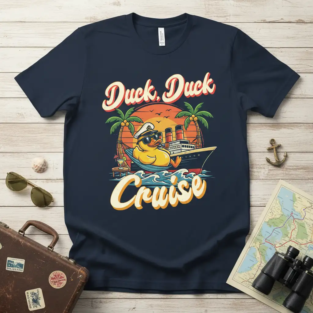 Duck, Duck Cruise T-Shirt is the ultimate apparel for anyone dreaming of their next getaway. This vibrant design perfectly encapsulates the joy and relaxation associated with a memorable vacation. Whether you’re planning a tropical escape, a summer adventure, or simply love the idea of sailing the open seas, this tee is made for you. It combines playful imagery with a catchy phrase that’s sure to bring smiles. Get ready to make a splash with this unique and eye-catching shirt.
