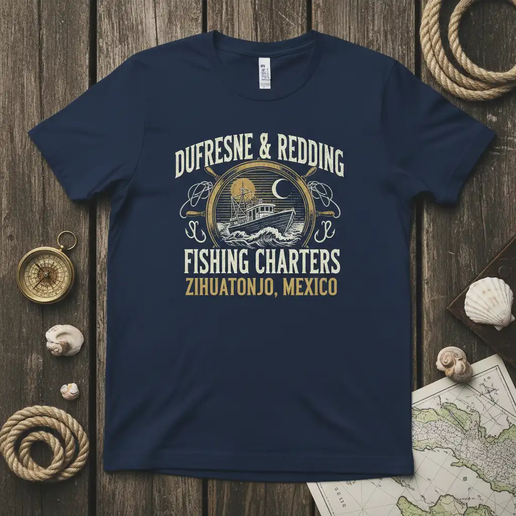 This unique t-shirt proudly displays the DUFRESNE & REDDING FISHING CHARTERS ZIHUATANJO, MEXICO design, a tribute to the thrilling experience of deep-sea fishing. The intricate graphic depicts a classic fishing boat navigating choppy waters under a serene moonlit sky, symbolizing the dedication and excitement of a successful charter. It’s a design that resonates with the spirit of adventure and the call of the open ocean.