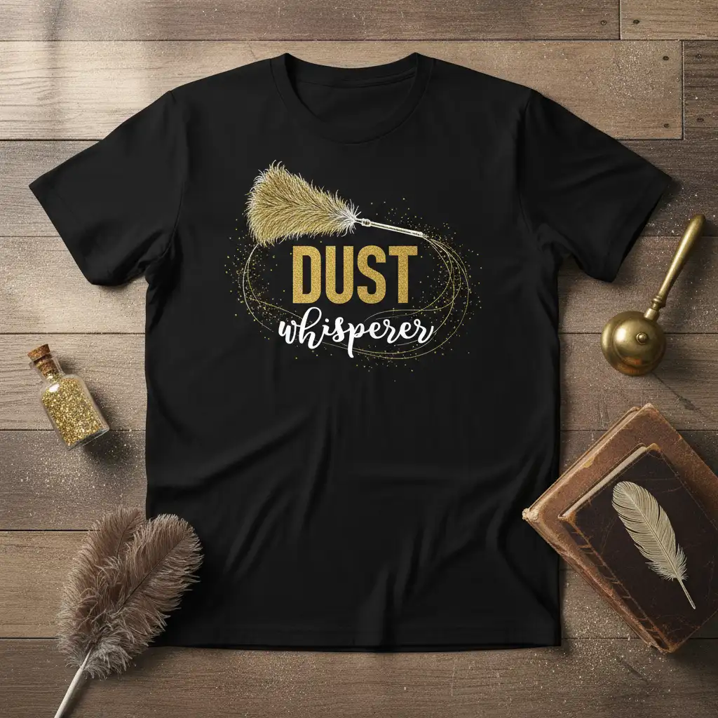 This “DUST whisperer” t-shirt is crafted for comfort and designed to make a statement. The eye-catching graphic features elegant gold glitter text that reads “DUST whisperer,” perfectly complemented by a stylized feather duster. It’s a playful yet sophisticated design that resonates with anyone who loves to keep their surroundings immaculate. The shirt itself is made from high-quality, soft fabric ensuring it feels as good as it looks, making it ideal for everyday wear.