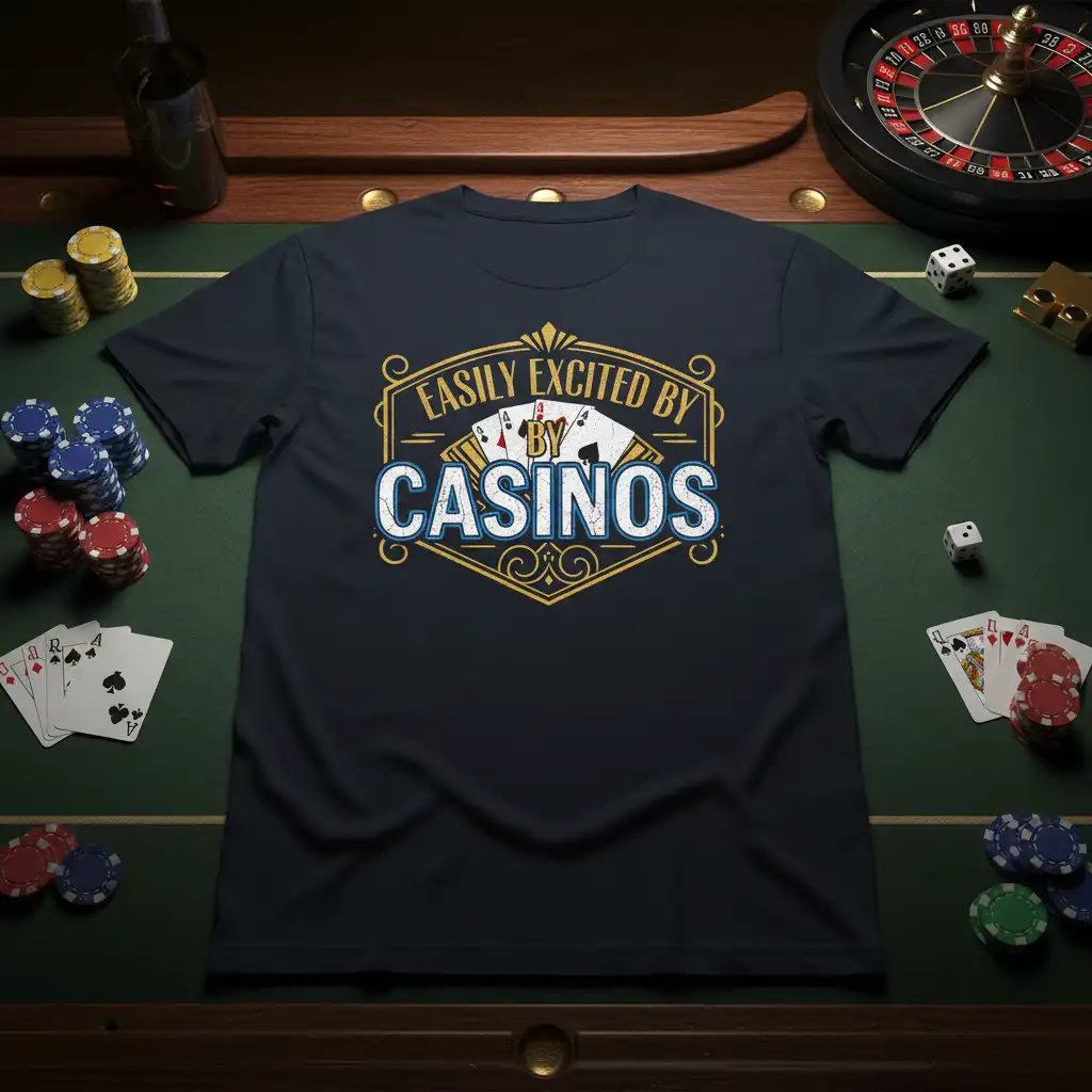 For those who feel the adrenaline surge with every card dealt and every dice roll, this “Easily Excited By Casinos” t-shirt is your ultimate expression. The design features bold typography and classic casino card imagery, evoking the vibrant atmosphere of the gaming floor. It’s crafted for comfort, ensuring you feel great whether you’re hitting the jackpot or enjoying a night out with friends.
