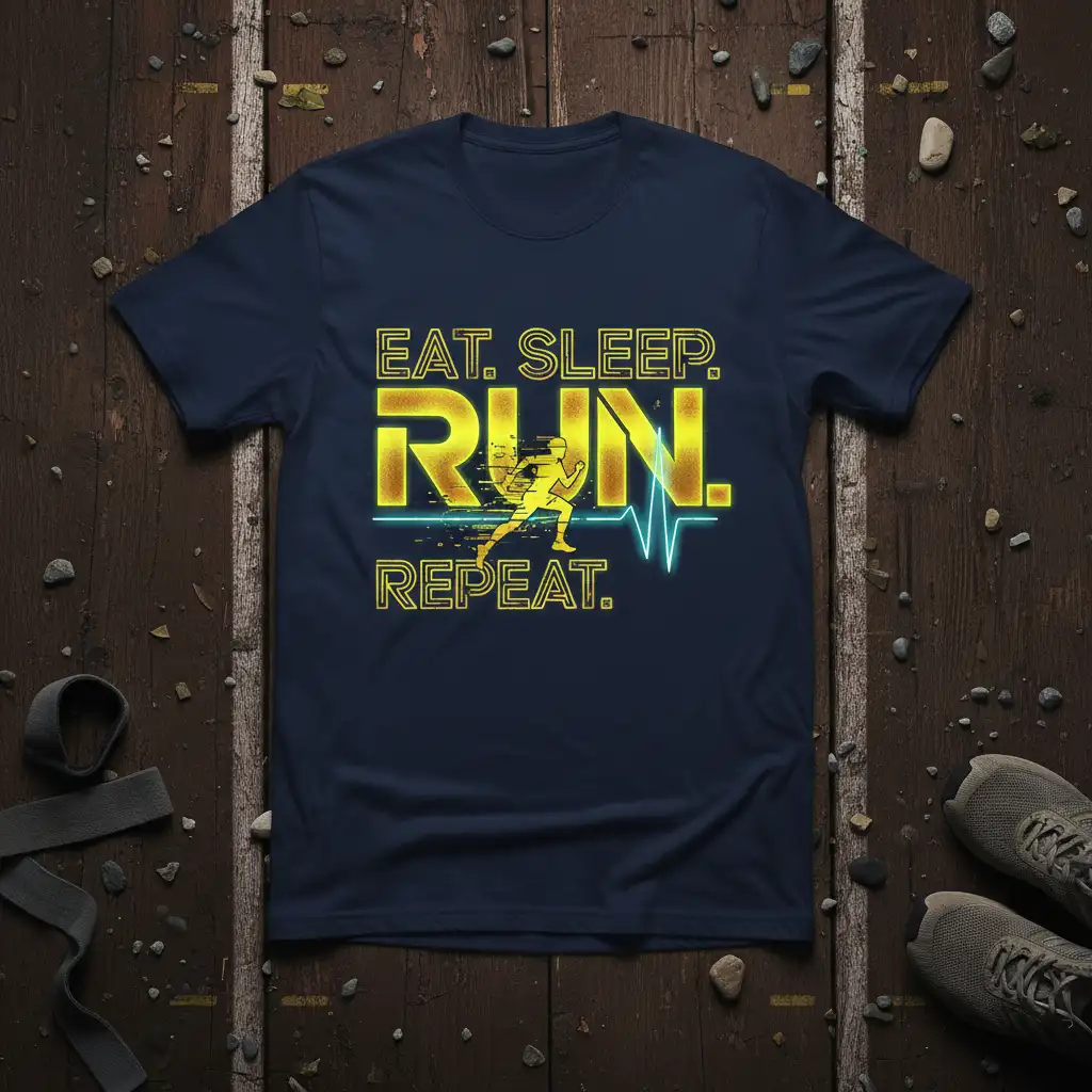 Pick from Black, Navy, Royal, Dark Heather, Red, and White to match your mood and wardrobe staples. Each colorway keeps the EAT. SLEEP. RUN. REPEAT. design clear and photo-ready for everyday wear.
