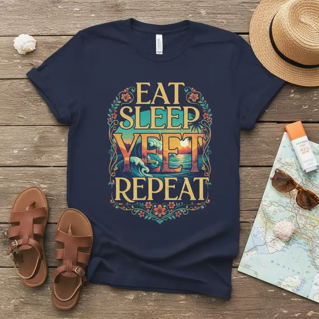 The “Eat Sleep Yeet Repeat” t-shirt is a testament to the fun and carefree spirit that many embody. It’s perfect for vacations, festivals, or just when you want to inject some extra fun into your day. The combination of the humorous phrase and the captivating retro beach scene makes this tee a standout piece. Don’t miss out on the chance to own this expressive and comfortable garment that perfectly embodies a fun-loving attitude. Order yours today and start living the Eat Sleep Yeet Repeat motto!