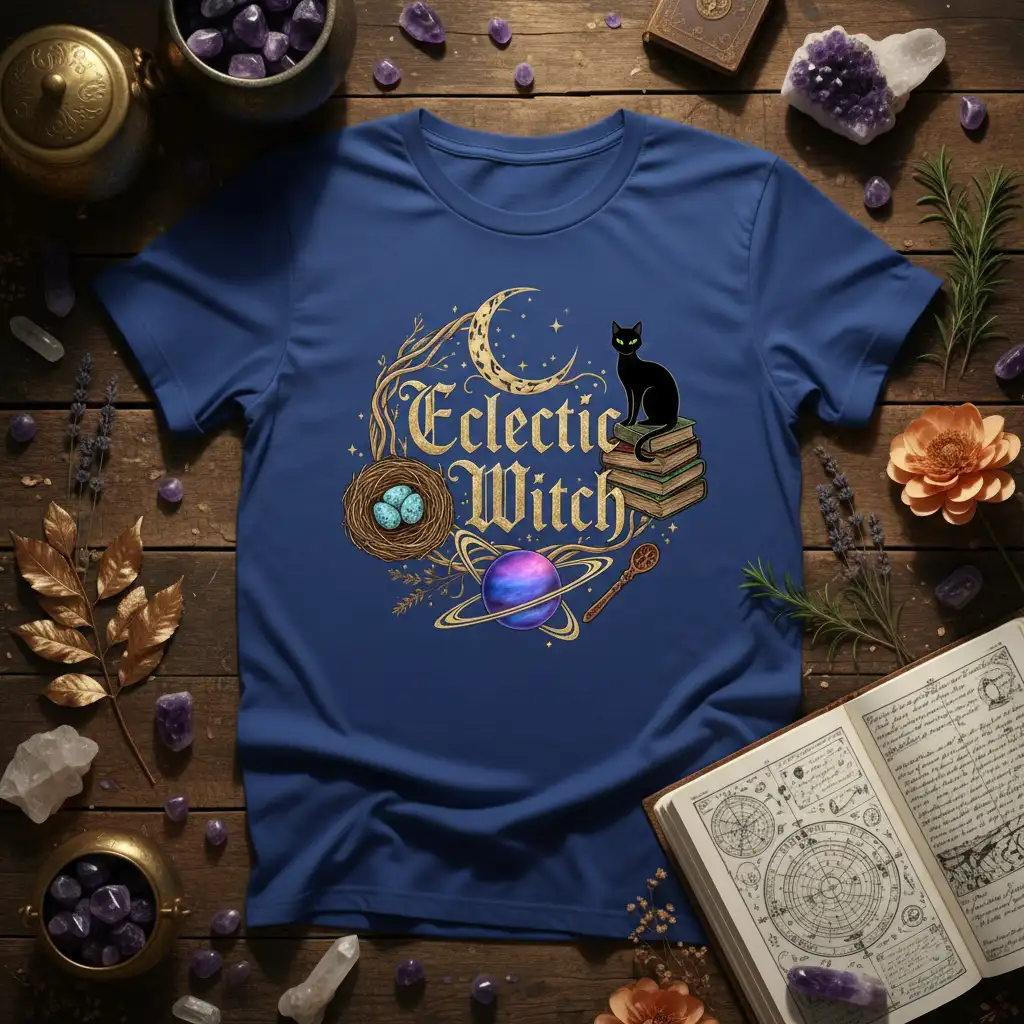 Eclectic Witch is more than just a phrase; it’s a statement of individuality and a celebration of the mystical arts. This t-shirt captures that spirit with a design that blends celestial wonders, familiar companions, and ancient symbols. It’s crafted for those who walk their own path, embracing a unique blend of magic, nature, and personal style. Wear it to express your connection to the cosmos and your appreciation for the subtle energies that surround us. This tee is a perfect addition to any wardrobe seeking a touch of enchantment and wonder.