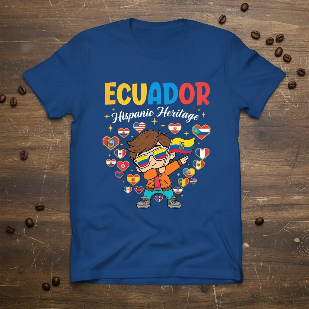The central graphic depicts a cheerful character dabbing, flag of Ecuador held high, surrounded by a heart made of various Hispanic flags. This imagery symbolizes unity, celebration, and the diverse but interconnected nature of Hispanic heritage. The playful yet meaningful design ensures that your shirt will be a conversation starter, fostering connections and shared appreciation for culture.