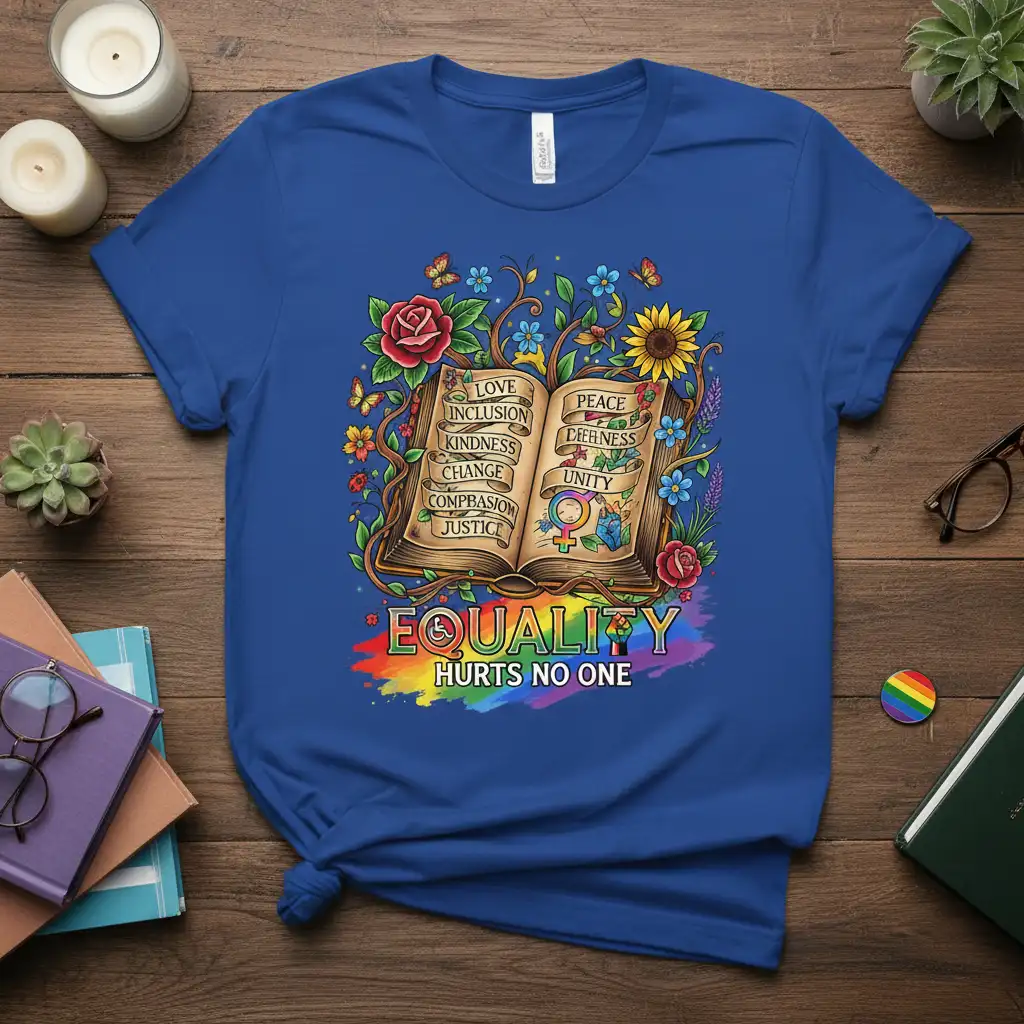 Celebrate the message that Equality Hurts No One with this vibrant and meaningful tee. Featuring symbols of love, inclusion, kindness, peace, and unity, this shirt is a beautiful statement for anyone who believes in a more equitable world. Made with comfortable fabric, it’s perfect for spreading positivity and showing your support.