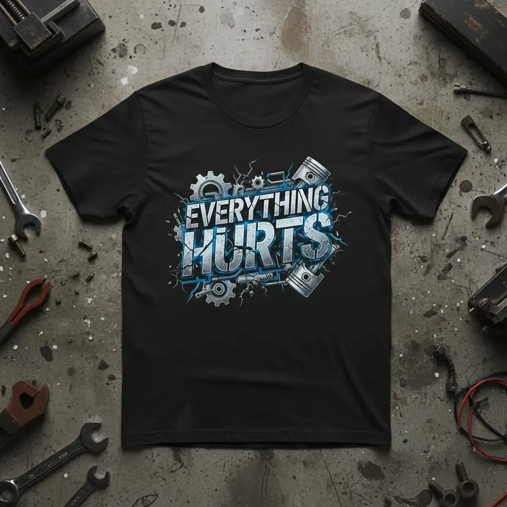 The striking visual of the “Everything Hurts” t-shirt is designed to appeal to the automotive community. Featuring a distressed metallic blue font, the text is surrounded by intricately detailed pistons and gears, all set against a backdrop of crackling effects and sharp lines. This design embodies the often-demanding nature of working with vehicles, making it a relatable and humorous choice for anyone in the auto repair world.