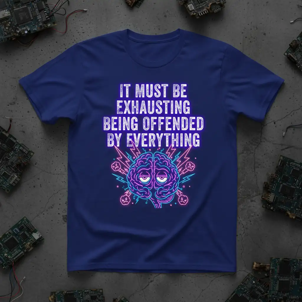 This t-shirt captures a sentiment that resonates with many, offering a humorous take on the modern tendency to find offense in nearly everything. The striking design features vibrant neon-like text that demands attention, paired with a visually compelling graphic of a brain looking utterly drained. It’s more than just clothing; it’s a wearable statement piece.